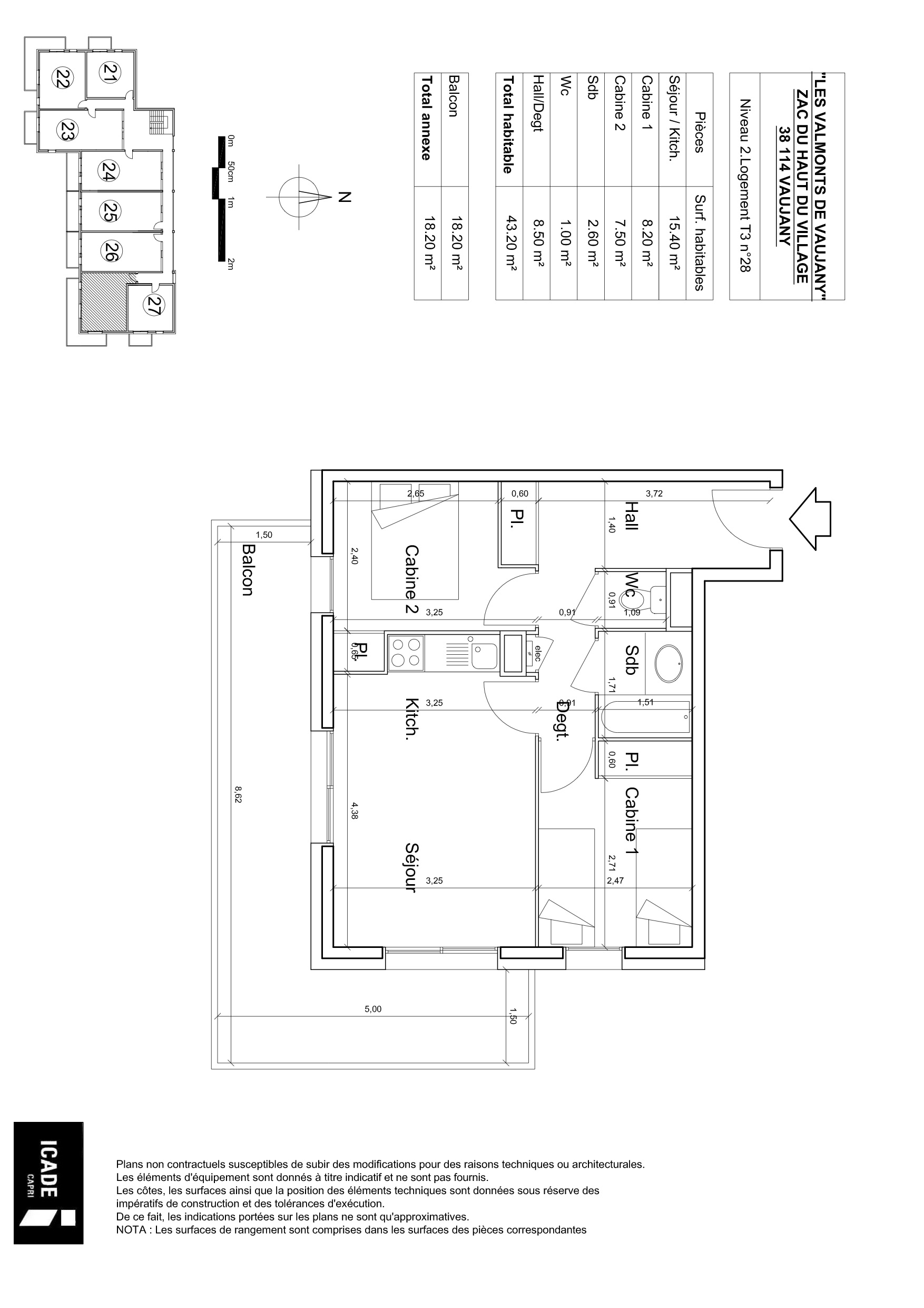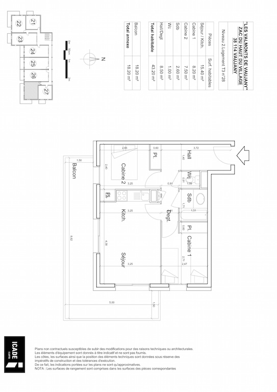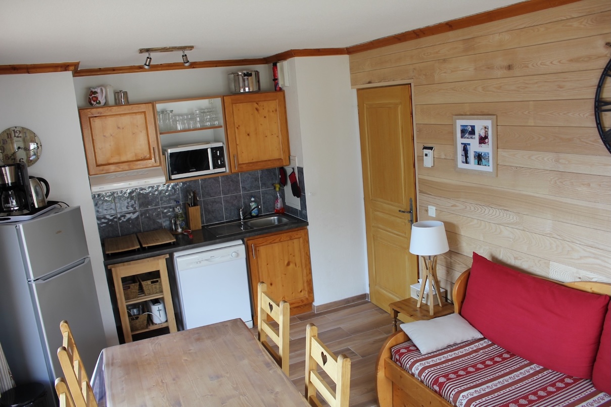 Apartment 28 is a 2 bedroom apartment on the second floor of Les Valmonts and offers 43 sqm of interior space. The accommodation faces south and east with wonderful views towards Les Domes des Rousses and La Fare waterfall. There is access to an impressive 18 sqm balcony from the open-plan living/dining/kitchen from where you can take in the panorama. There is a double bedroom and a bunk bedroom (both with fitted wardrobes) and if required the sofa in the living area can be converted into a very comfortable bed. The bathroom has a shower and sink and separate wc. The apartment is well equipped with dishwasher, fridge, electric hob, grill, microwave, coffee-making machine, TV/DVD, iPod dock and hairdryer.
