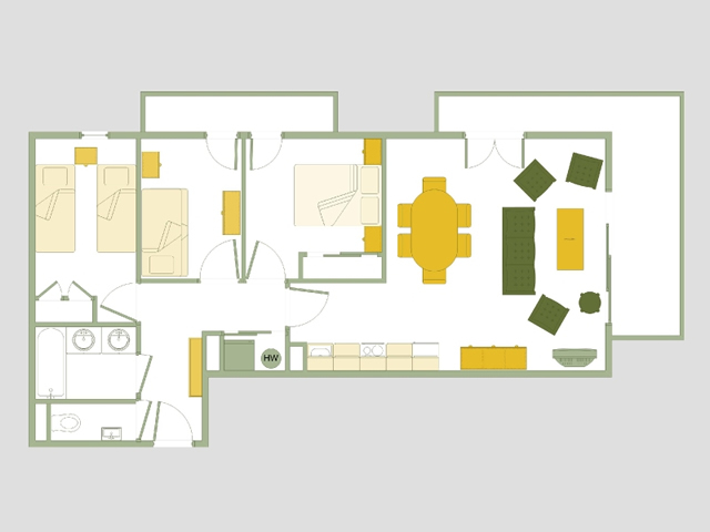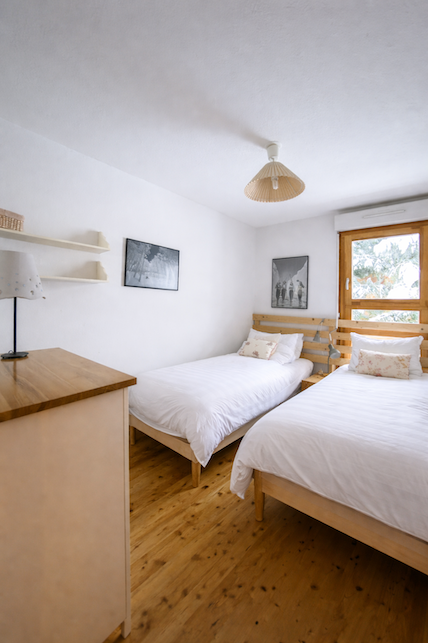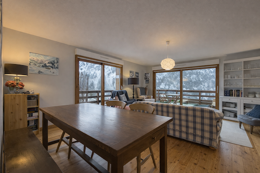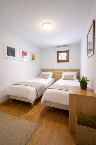 This three bed apartment is on the third level, accessed by lift, and has 70 sqm of interior space plus balconies and awe-inspiring dual-aspect views across the valley. There is an open-plan living room, double bedroom, and two twin bedrooms. The bathroom has a bath with shower over and toilet. There is also a separate toilet.